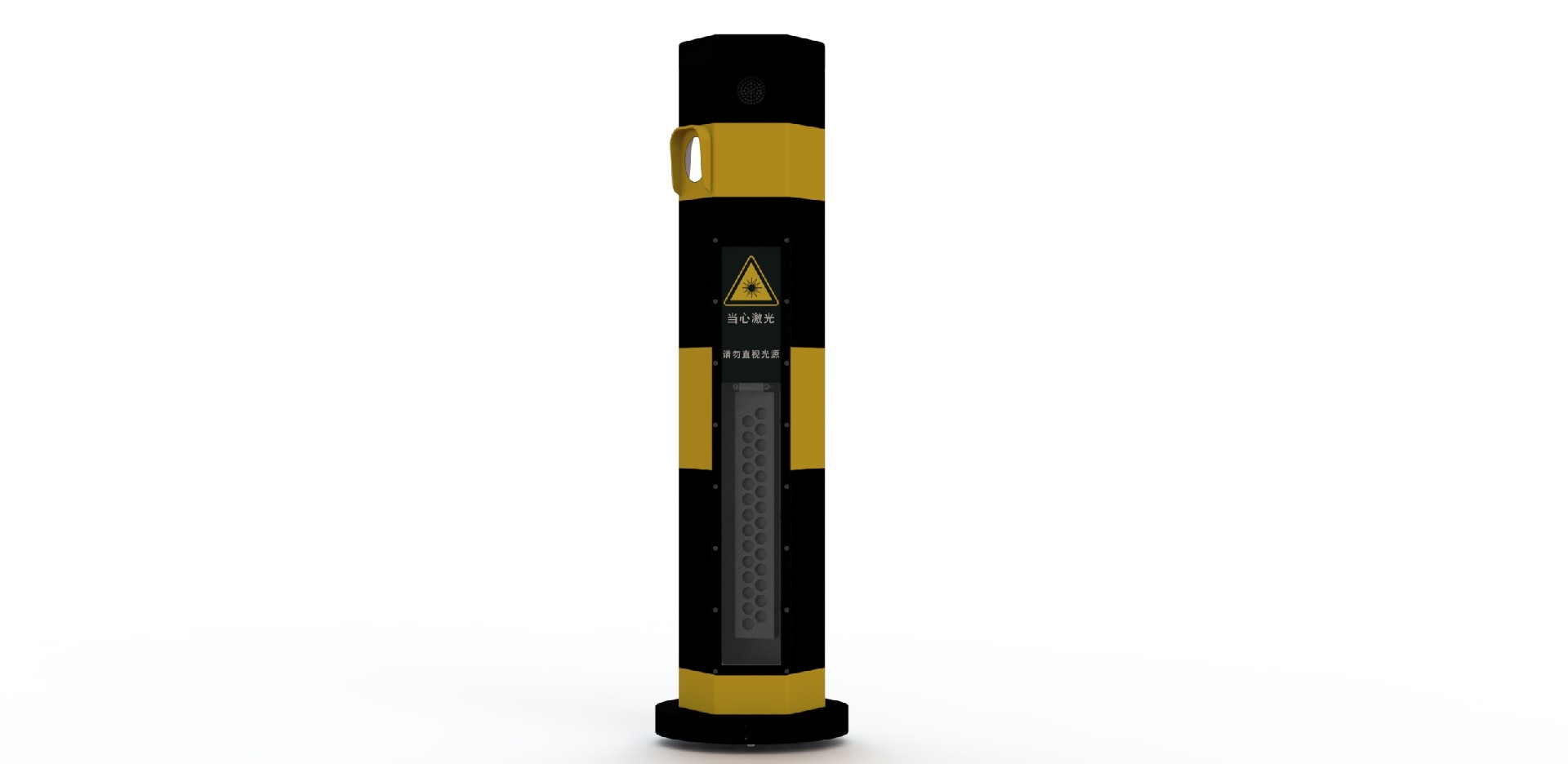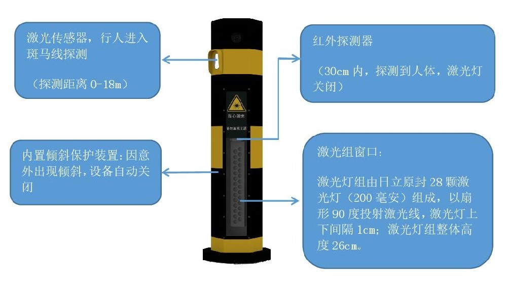 在與廠家技術(shù)人員溝通得知,該機(jī)采用激光+紅外的雙感知方案,激光燈組由日立原封28顆激光燈(200毫安)組成,以扇形90度投射激光線,激光燈上下間隔1CM,激光燈組整體高度為26CM,激光不會(huì)直射人眼。行人感應(yīng)器有效探測(cè)范圍20米。還具有傾斜保護(hù)和行人近距離保護(hù)功能,當(dāng)激光樁意外傾斜或有行人靠近激光燈范圍30cm以內(nèi)時(shí),激光燈關(guān)閉,起到一個(gè)很好的保護(hù)行人的作用。